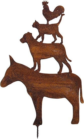 Ecosoul Gartendeko Bremer Stadtmusikanten Tierpyramide Mit Dorn Zum Schrauben Esel Hund Katze Hahn Baumtiere Metall Rost Deko Amazon De Garten